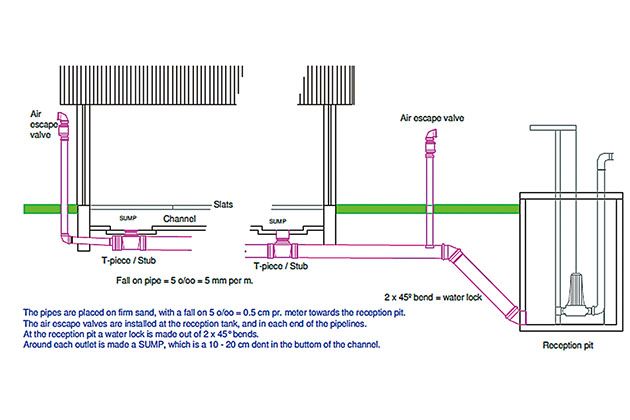 It is an advanced way to effectively collect pig farm pollution. It is mainly divided manure tank into several sections under the pig houses through the slotted floor. Install a joint under each section of the manure tank and the joint connect the main siphon pipe under the manure tank. A manure plug is provided at the joint of the manure tank to ensure that liquid manure can be stored in the pig manure tank. When want to empty the manure tank, the worker can pull the plug which is lifted with hook, at this time, the manure in the tank can be discharged from the siphon pipe under the action of pressure difference.